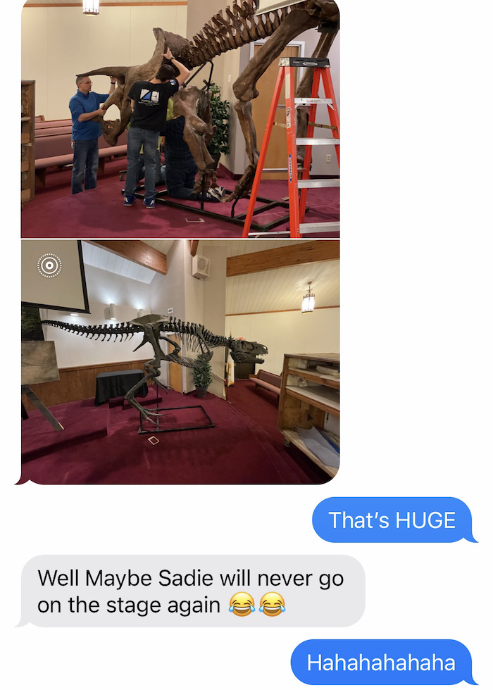 Our church has a stage at the front of the sanctuary and Sadie thinks it’s the coolest thing to run onto the stage any chance she gets. We’re having a seminar on dinosaurs and Creation at our church this week (if you’re local and want to come, send me an email!!) and Jimmy was at our church yesterday setting up the displays and sent me this text.