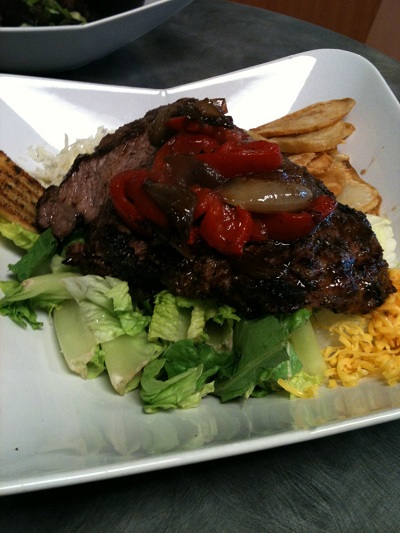 Steak salad topped with red peppers and onions from a local cafe