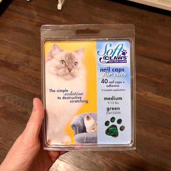They’re nail caps for cats as an alternative to declawing when dealing with scratching. Our Malcolm boy is pretty destructive with his nails. He’s ruined our curtains and fabric chairs and benches, but that’s to be expected. He has been scratching Sadie lately, so we decided to try out Soft Claws (<–affiliate link!).