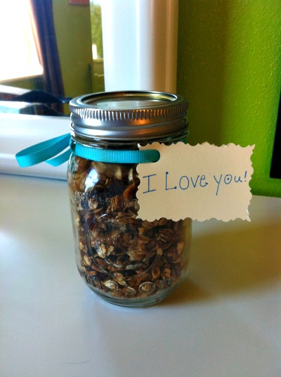 After the granola cooled, I put some in a mason jar. I made a little “I love you” note, attached it to a ribbon, and tied the ribbon around the jar. I think I enjoyed this girly touch more than Jimmy.