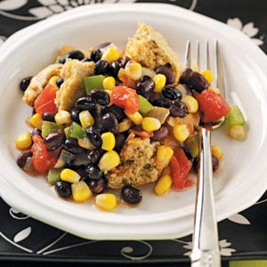 Black Bean and Cornmeal pie! I have never made it before, but I have made a turkey pot pie with a biscuit topping. This is kind of like beans with a corn bread topping baked in the oven 🙂 I didn’t realize it, but my house will now be participating in Meatless Monday ! Go Smith’s!!!
