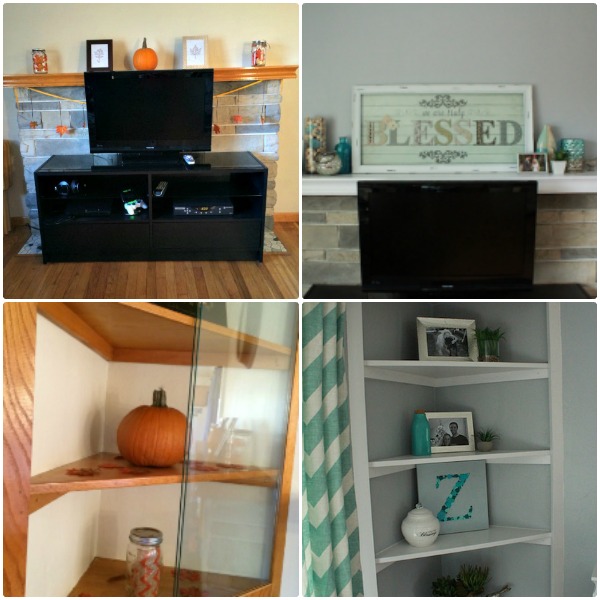 Our living room walls were previously off-white. We also had a wooden mantle and corner shelf unit. We decided to paint the walls gray (Whirlwind by Olympic), the mantle and corner shelf white (Ultra White by Valspar), and the ceiling white (White by HGTV Home).
