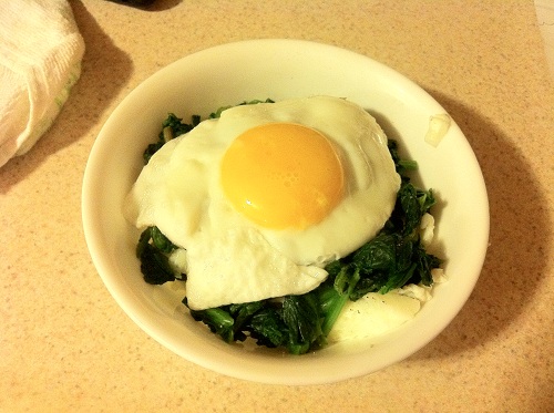 A random part of a meal: an egg on top of spinach and more eggs with olive oil.