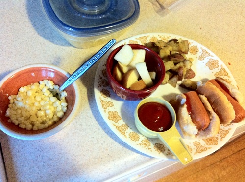 Dinner: hot dog, ketchup, corn, sliced pear, and potatoes.