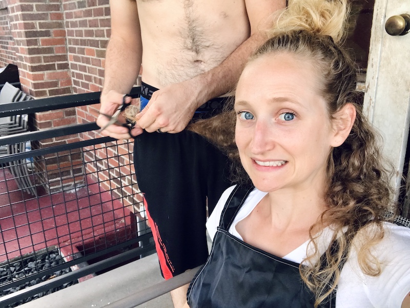 He was way more nervous than me about making a mistake while giving me a trim but I assured him that my crazy hair hides any cutting mishaps pretty well 🙂