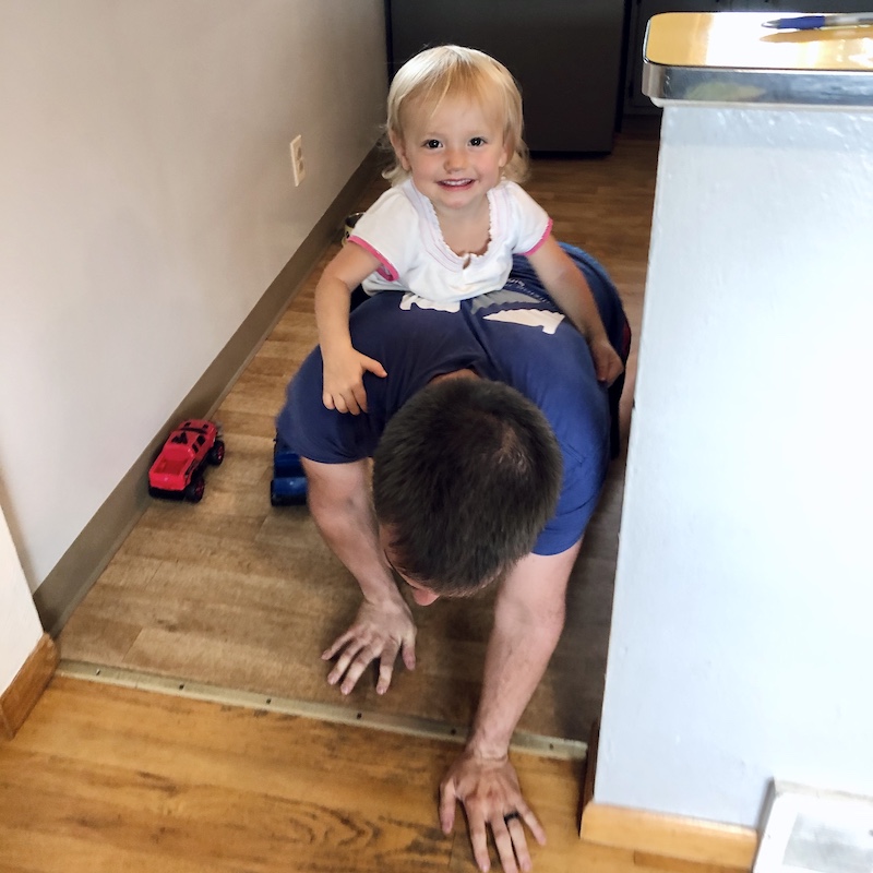 Things are a little less messy around here and her toys feel new to her when it has been a while since she last played with them. I think her favorite “toy” is just time with mom and dad. She rode around on Jimmy’s back and thought it was the coolest.