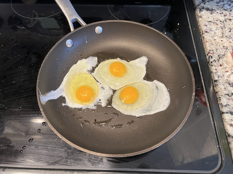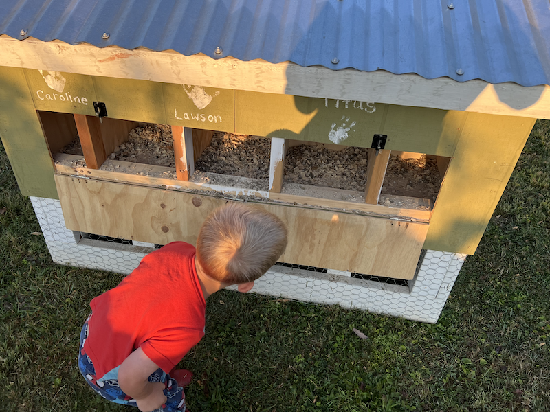 Lawson wanted to check for eggs (a few of our hens just started laying so the kids are very excited). We didn’t find any this morning, but we went back in and made eggs for breakfast. They’re so small right now, I think it’s cute!