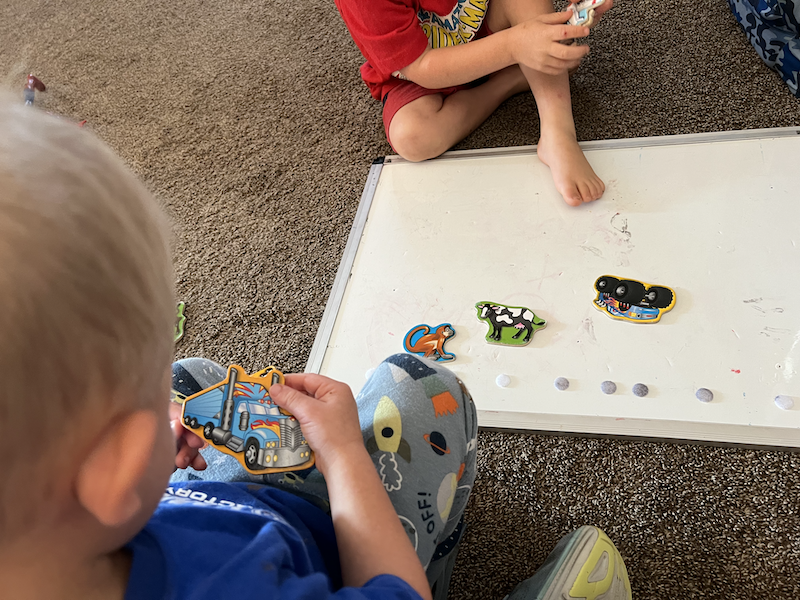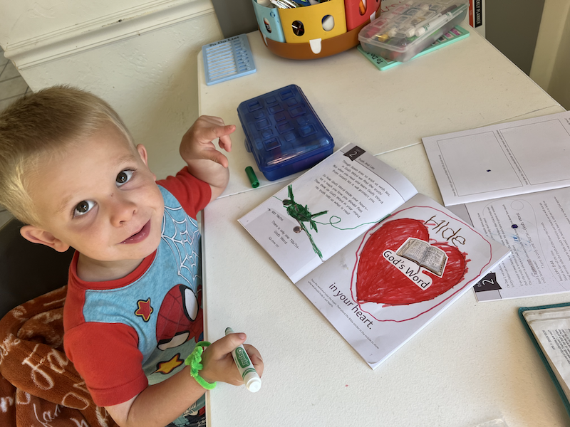 Caroline’s alarm clock goes off at 8 am but she snoozed till 8:20 am! We read a book in bed and then she did her morning chores and came down for breakfast! Titus was still sleeping (!!!) and when he got up, Lawson was able to do his chores (he makes his bed and puts his clothes away).