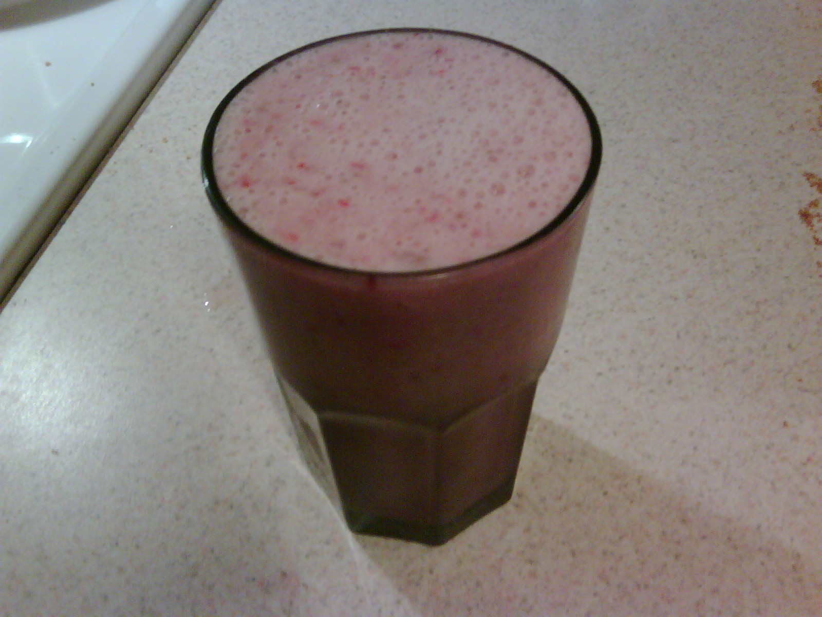 Blend 1 banana, 1 cup strawberries, 1/2 cup vanilla yogurt, 1/2 cup milk, 2 tsp honey, a pinch of cinnamon, and ice.