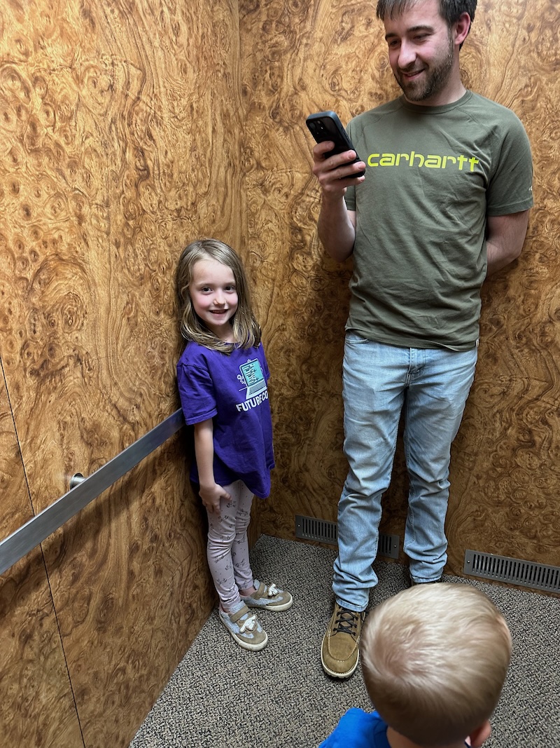 We brought Sadie to her computer coding class and there was an elevator to get upstairs to the class. Mordecai and Sadie both love elevators. Me? Not so much. In fact, I once swore I would never ride in one again after being trapped in one with a group of people and my mom. I’ve overcome that fear a tiny bit and decided we could ride in it.