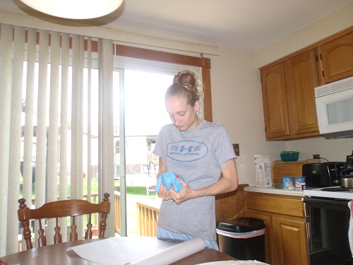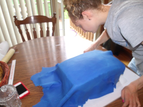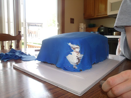 I frosted in between the layers with chocolate frosting and then did a vanilla frosting crumb coat on the outside of the whole cake.After putting on the crumb coat I started working with the fondant. I bought a 5 pound box of white fondant and it took me about 2 hours to dye it the exact shade of blue that I wanted. I rolled and dyed and rolled and dyed until I got that bright blue!Putting the fondant on the cake was the toughest part. It kept falling apart because I had SO much cake to cover. Many disaster spots appeared…I just patched everything up as best I could because I was getting tired and Jimmy was coming over to my house in a few hours. I still had to frost the front of the cake to make the welding knobs.